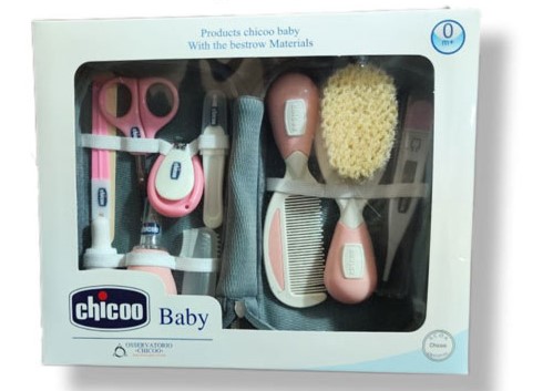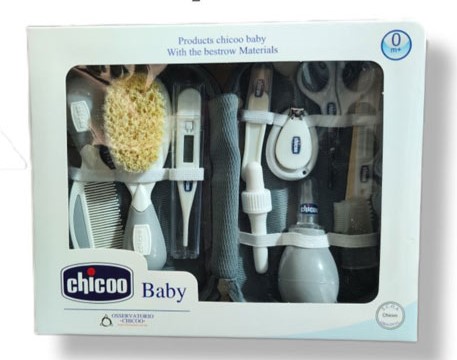 ست مانیکور چیکو در دو رنگ طوسی و کرم شامل اقلام کاربردی: شانه و برس، قیچی، ناخنگیر مخزن دار، پوآر بینی، سوهان ناخن، مسواک انگشتی، شیردوش، تب سنج، قطره چکان، عصاره خوری، داروخوری، دندانگیر و پستانکی.